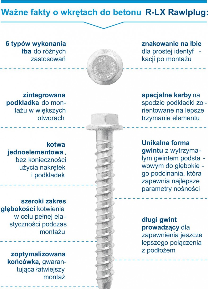 Wkręty do betonu R-LX Rawlplug to faktyczne połączenie najnowszej dostępnej technologii oraz 100-letniego doświadczenia w pracy nad rozwojem produktów. To najbardziej zaawansowanie technicznie rozwiązanie, które zapewnia imponujące właściwości użytkowe i wydajność. Nie bez znaczenia jest pakiet komplementarnych z oferowanymi produktami usług, jakie Rawlplug posiada w swoim portfolio: od doradztwa technicznego, przez specjalistyczne szkolenia, po kompleksową dokumentację. Warto je sprawdzić na rawlplug.com. Naszym zdaniem wybór jest prosty.