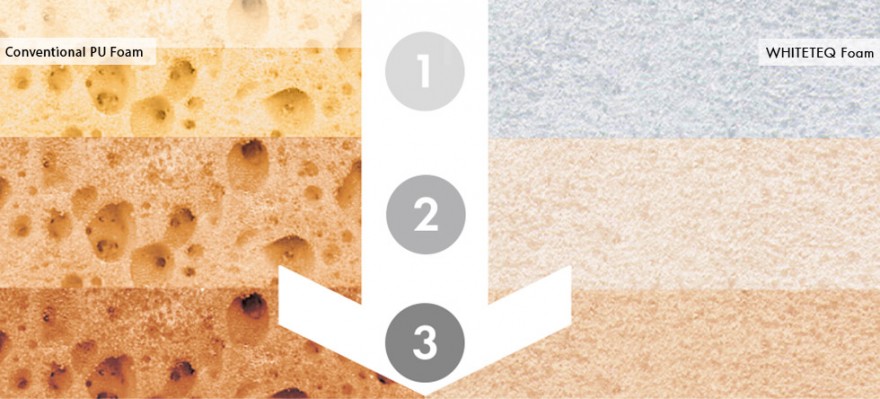 Standardowe piany PU często nie są dostatecznie odporne na czynniki mechaniczne. Wyższa elastyczność piany Ceresit WHITETEQ QUATTRO eliminuje ryzyko pęknięć w strukturze i zapewnia maksymalną trwałość. Długotrwałe nasłonecznienie zwykłych pian PU powoduje ich ciemnienie. Piana traci wówczas swoje właściwości i staje się bardziej krucha. Ceresit WHITETEQ QUATTRO posiada 4x większą odporność na działanie UV, co wzmacnia trwałość piany i ogranicza efekt jej starzenia.